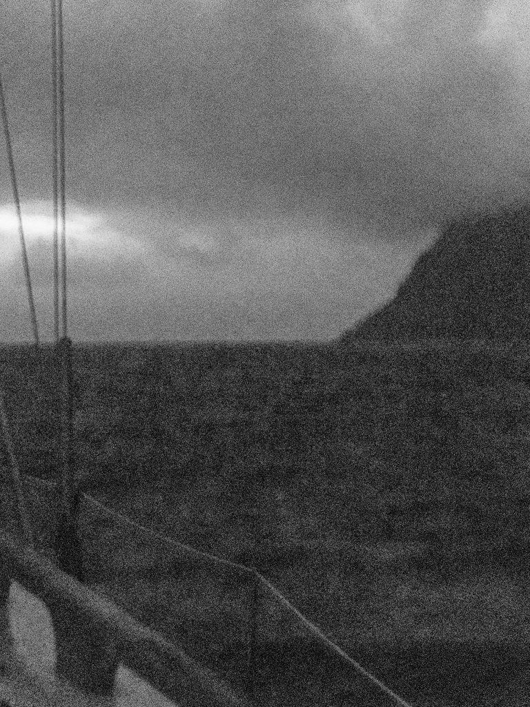 Als wir dieses gegen 0:50 Uhr erreichten, war unsere Fahrt schon auf 0,7 Knoten (1,2 km/h) gesunken. Unser 55 PS Dieselmotor kämpfte gegen 35 Knoten Wind und eine steile 2 Meter Welle, die sich am Fjordeingang aufgrund der Gezeiten vor uns aufgebaut hatte. Als der Autopilot nach einer Welle die Kontrolle verlor und wir schlagartig in Richtung Steilküste trieben, verwarfen wir unseren ursprünglichen Plan und entschieden uns, motorunterstützt mit leicht ausgerolltem Vorsegel in den Fjord zu kreuzen. Wir setzten unseren ersten Schlag kurz vor 01:00 Uhr und steuerten wieder auf den offenen Nordatlantik zu. Allerdings bemerkten wir sehr schnell, dass sowohl Welle als auch Wind zunahmen, je weiter wir uns vom Kap entfernten, weshalb wir schon bald den zweiten Schlag zurück in Richtung Küste setzten.